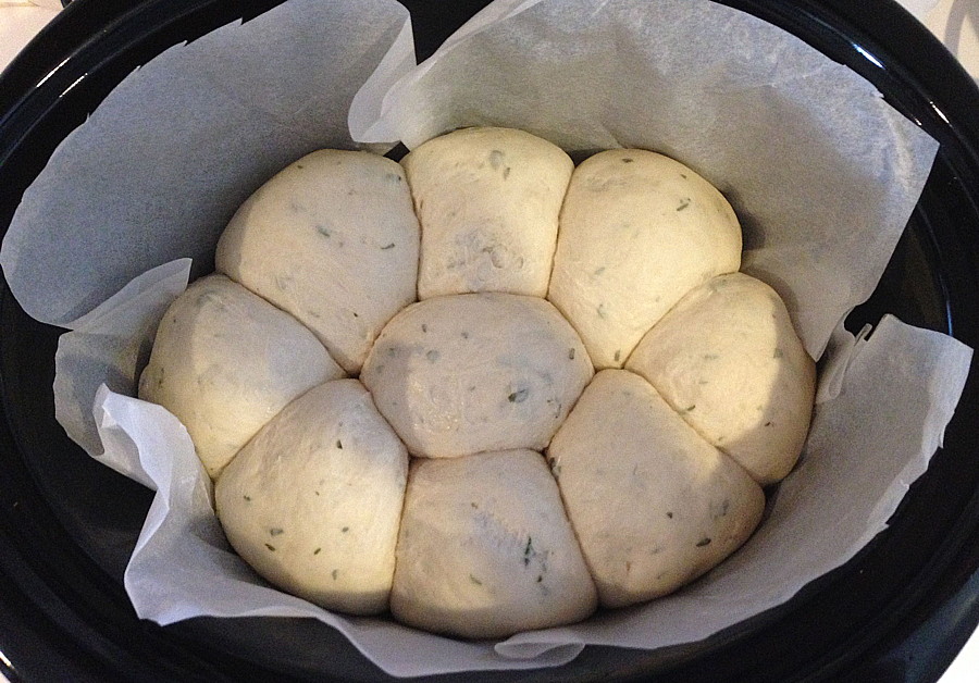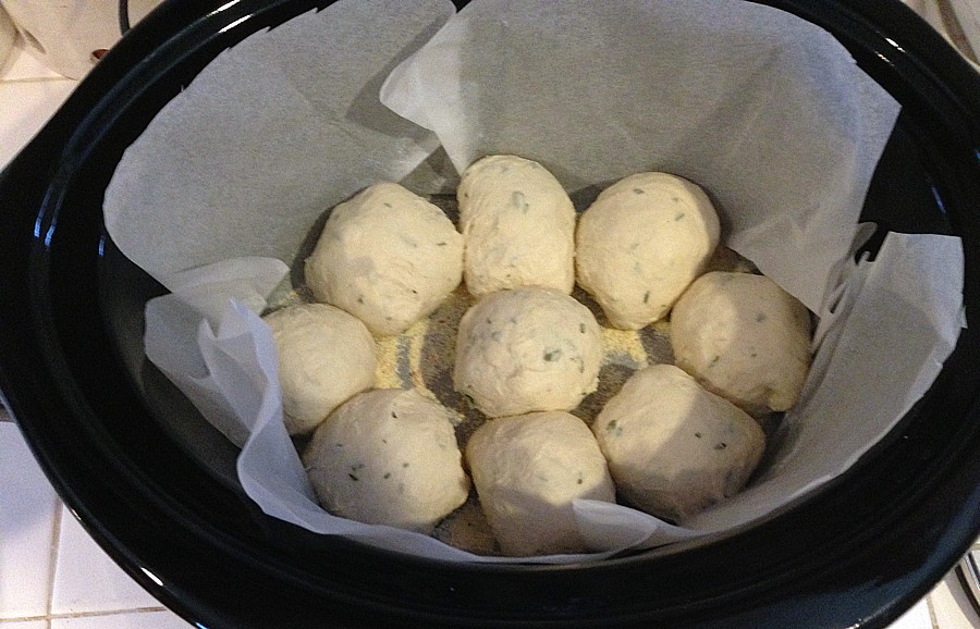- Line a large slow cooker with parchment paper, and sprinkle it liberally with cornmeal. Punch dough down, and divide it into 9 equal sections. Form each into a ball and distribute evenly on the parchment in the base of the slow cooker.
